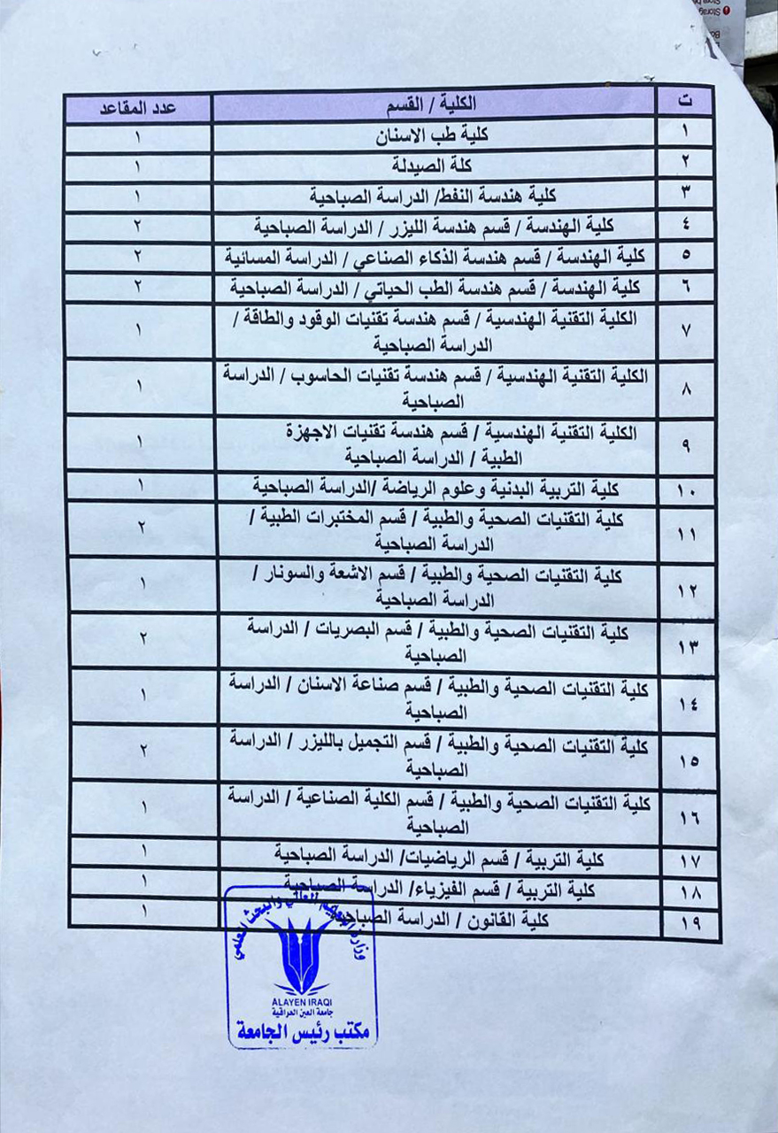 تُعلن مؤسسة السجناء السياسيين عن تقديم جامعة العين العراقية الأهلية (25) خمسة وعشرين مقعداً دراسياً مجانياً للسجناء السياسيين وذويهم من الدرجة الأولى، للعام الدراسي 2025 – 2026، وذلك في الاختصاصات الموضّحة في الجدول المرفق.