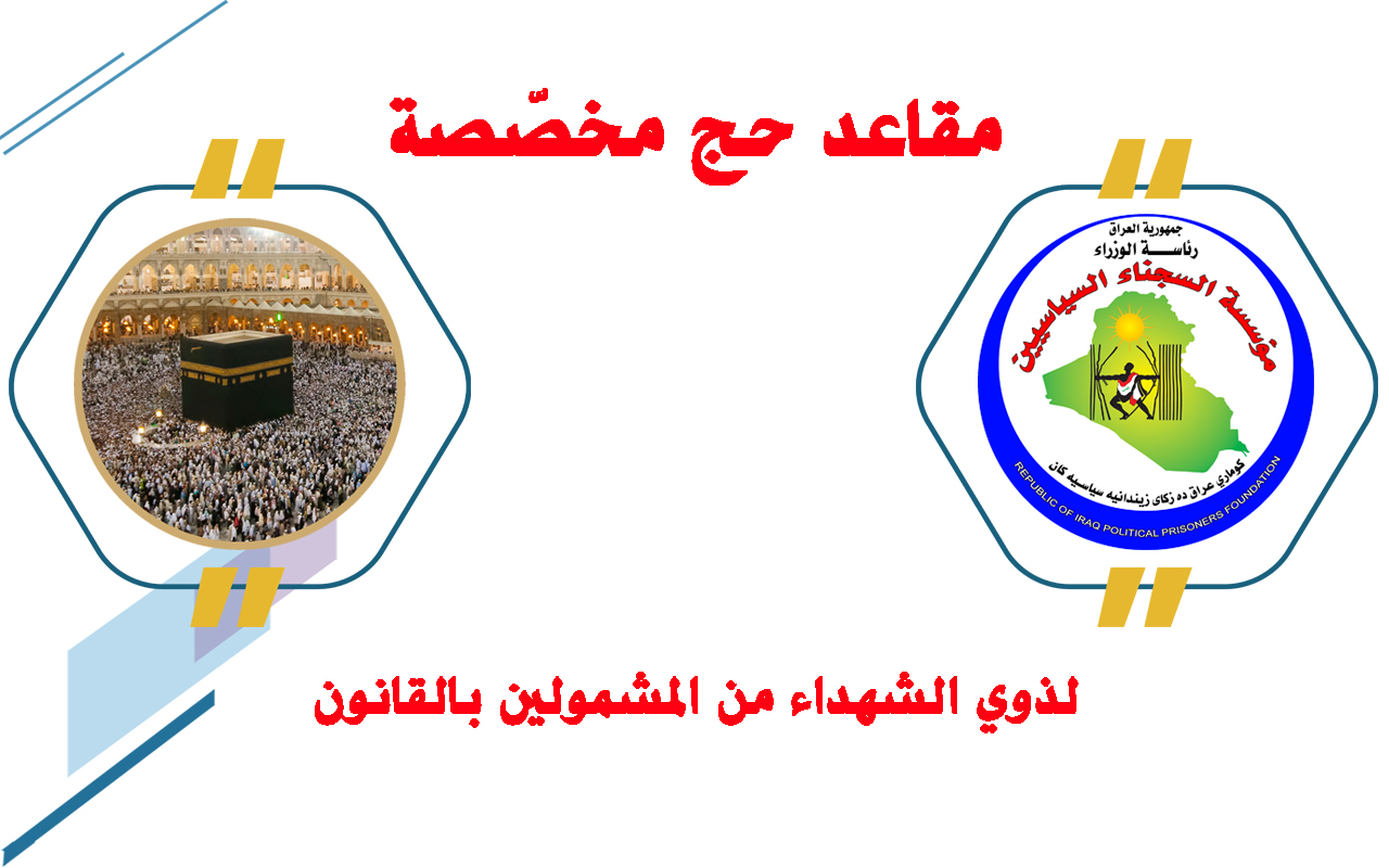 تعلن مؤسسة السجناء السياسيين، وبمتابعة حثيثة من معالي رئيس المؤسسة الدكتور وليد السهلاني، عن الموافقة على منح ذوي الشهداء من المشمولين بقانون المؤسسة ومن الدرجة الاولى مقاعد مخصّصة من مؤسسة الشهداء لأداء فريضة الحج.