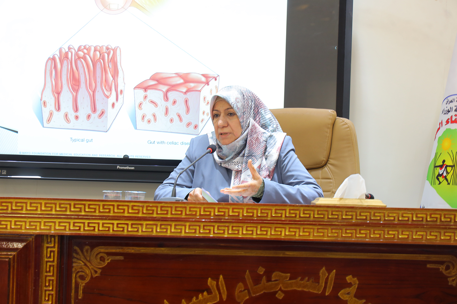 وقدمت الباحثة سهاد الجبوري مديرة منظمة حياة خالية من الجلوتين للصحة العامة محاضرة تناولت فيها شرحًا مفصلًا ووافيًا عن مرض السيلياك، متطرقةً إلى أسبابه وأعراضه وطرق تشخيصه، فضلًا عن سبل الوقاية منه وآليات العلاج والأنظمة الغذائية المناسبة للمصابين به. كما استمعت إلى أسئلة واستفسارات الحضور وأجابت عنها، بما أسهم في تعزيز الوعي الصحي وتصحيح المفاهيم المرتبطة بالمرض.